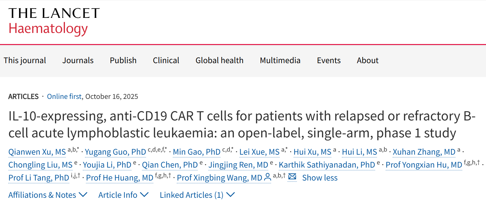 The published article, titled “IL-10-expressing, anti-CD19 CAR T cells for patients with relapsed or refractory B-cell acute lymphoblastic leukaemia: an open-label, single-arm, phase 1 study” (DOI link:https://doi.org/10.1016/S2352-3026(25)00253-4), reports on an investigator-initiated clinical trial (NCT05747157). The trial was led by Professor Xingbing Wang of the First Affiliated Hospital of the University of Science and Technology of China (Anhui Provincial Hospital), in collaboration with teams from Zhejiang University, the Swiss Federal Institute of Technology Lausanne (EPFL), and Leman Biotech. The investigational product, Meta10-19, was designed, developed, and provided free of charge by Leman Biotech.