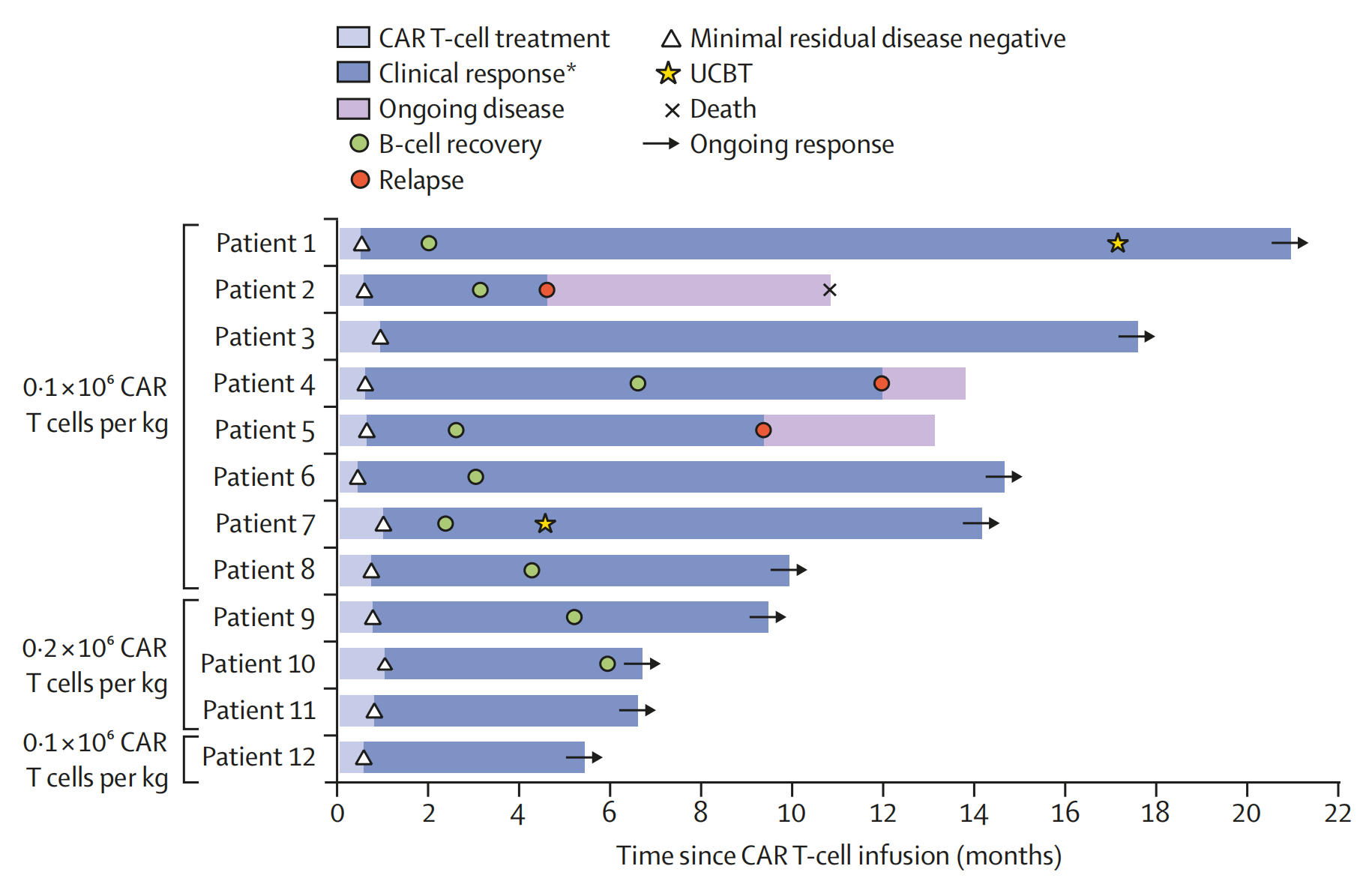 The study enrolled 12 patients with relapsed/refractory B-ALL, with a median follow-up time of 12.5 months. Patients received a single intravenous infusion of Meta10-19 CAR-T cells at doses ranging from 0.1 to 0.2 × 10⁶ cells/kg.